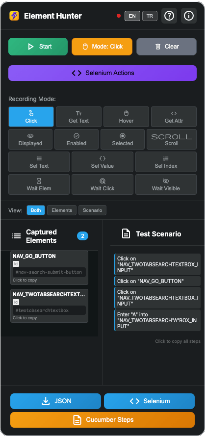 Instantly capture web elements, create Cucumber-ready scenarios,
